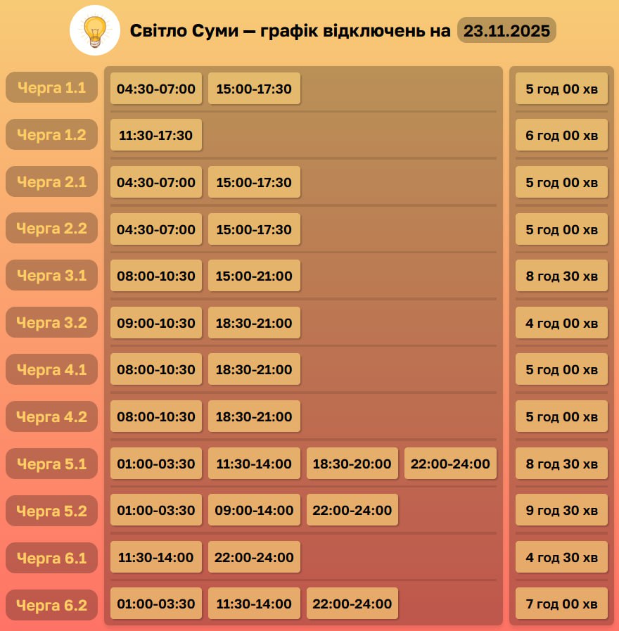 Завтра, 23 листопада, діятимуть графіки погодинних відключень. Відповідно до команди НЕК “Укренерго”: