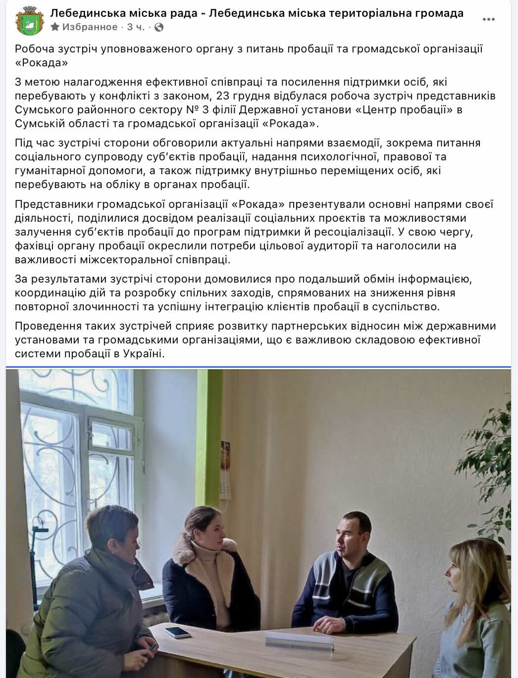 Цього разу «Рокада» висадилася у Лебедині. Але тепер їхня ціль — не змучені мами з дітьми, а… особи, які перебувають у конфлікті з законом. 23 грудня благодійники провели «робочу зустріч» із представниками місцевого Центру пробації.